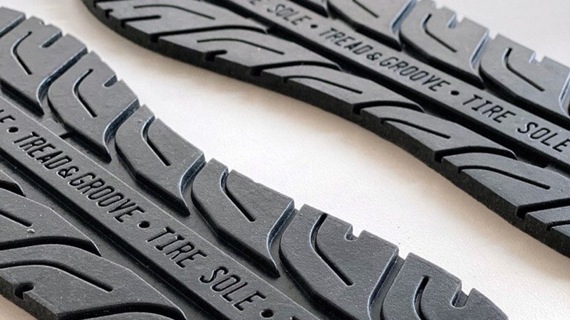 Collected from old tires and worn-out soles, recycled rubber becomes new outsoles.