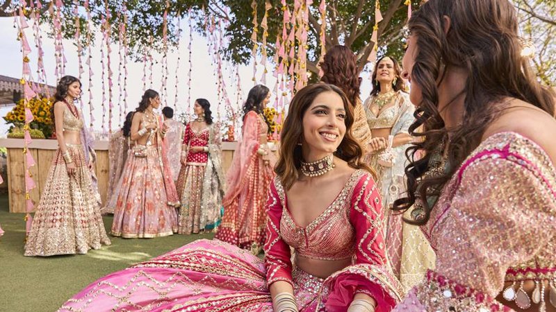 Lehengas define grandeur. In 2025, expect lighter fabrics, minimal embroidery, and pastel tones over heavy zari work.